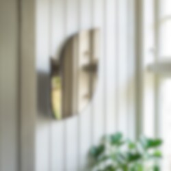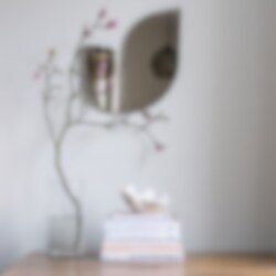 Perho is a wall-mounted mirror. The idea with hinges dividing the mirror into two parts is inspired by “perhonen”, which means butterfly in Finnish. You can adjust the angle of the smaller part of the mirror, just like a wing.