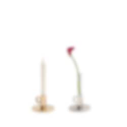 Vesper candlestick is a modern, updated version of the classical chamberstick candle holder. It is available in brass or aluminium. You can turn it into a vase by replacing the candle with a Flora glass insert.