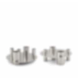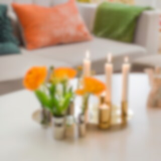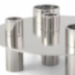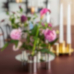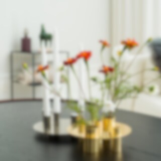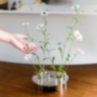 Awa is a reversible flower vase and candle holder that appears to be hovering in the air. Its perforated circular plate is reminiscent of a water pond with bubbles or perhaps water lilies.