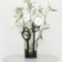 “My mother often made unique flower arrangements and was always on the pursuit of finding beautiful vases. I believe that is why I started thinking of a vase with a water vessel and some kind of construction around it to make that kind of flower arrangements possible. But it was not until Fanny received a gift on her 50th birthday that i visualized the vase. The shape was ought to be playful without being ”trendy” and the material should express something timeless through ageing well.”