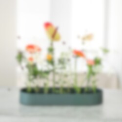 The vase is made of stainless steel, but it is also available with a partially matt powder coated dark green surface. For the more festive occasions, you can add the accompanying sign with the text "Hurray".