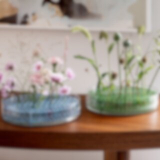 The iconic Äng vase is available in various sizes, with Äng Mega being the largest model that allows grand flower arrangements. With its simple yet clever design, arranging flowers at different heights and quantities is made possible. The vase insert is made of brass with a powder-coated finish and is accompanied by a mouth-blown glass bowl from Czech Republic.