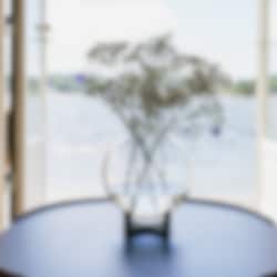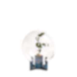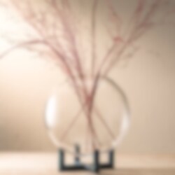 Orb is a vase where the glass itself creates a frame around the flowers. It both protects and enhances the plant inside. Remove the top part of the metal vase and rotate the glass and you will get a different expression. The insert is made of oxidized brass and the glass is mouth blown from Böhmen, Czech Republic.